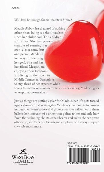 Will love be enough for an uncertain future? Maddie Abbott has dreamed of nothing other than being a schoolteacher since her childhood. The children adore her. She has proven capable of running her own classroom, but one person stands in her way of reaching her goal. She and her best friend, Meagan, are enjoying their freedom and living on their own in Middle Tennessee. Struggling to stay ahead of her expenses while trying to survive on a meager teacher's aide's salary, Maddie fights to keep that dream alive. Just as things are getting easier for Maddie, her life gets turned upside down with new struggles. While one man wants to possess her, another wants to love and protect her. But will either of them believe her innocent of a crime that points to her and only her? From the beginning, she stole their hearts, and unless she can prove otherwise, she fears her friends and employer will always suspect she stole much more.