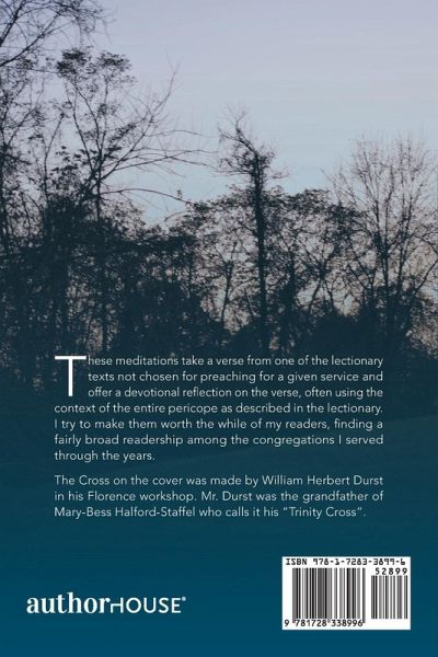These meditations take a verse from one of the lectionary texts not chosen for preaching for a given service and offer a devotional reflection on the verse, often using the context of the entire pericope as described in the lectionary. I try to make them worth the while of my readers, finding a fairly broad readership among the congregations I served through the years. The Cross on the cover was made by William Herbert Durst in his Florence workshop. Mr. Durst was the grandfather of Mary-Bess Halford-Staffel who calls it his "Trinity Cross".