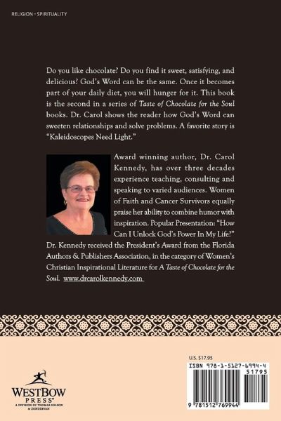 Do you like chocolate? Do you find it sweet, satisfying and delicious? God’s Word can be the same. Once it becomes part of your daily diet, you will hunger for it. This book is the second in a series of AWARD WINNING TASTE OF CHOCOLATE FOR THE SOUL books. Dr. Carol shows the reader how God’s Word can sweeten relationships and solve problems through stories and psalms. The first section showcases psalms written by her and grandson Tyler. What a delightful journey! A favorite grandson psalm: "God, You Are Like Ice Cream to Me". Popular stories/testimonies: "God Will Knock Your Socks Off!" and "Kaleidoscopes Need Light." Wouldn’t it be wonderful if we could get people as excited about God’s Word as they are about chocolate? drcarol@drcarolkennedy.com
