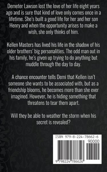 Demeter Lawson lost the love of her life eight years ago and is sure that kind of love only comes once in a lifetime. She's built a good life for her and her son Henry and when the opportunity arises to make a wish, she only thinks of him. Kellen Masters has lived his life in the shadow of his older brothers' big personalities. The odd man out in his family, he's given up trying to do anything but muddle through the day to day. A chance encounter tells Demi that Kellen isn't someone she wants to be associated with, but as a friendship blooms, he becomes more than she ever imagined. However, he is hiding something that threatens to tear them apart.