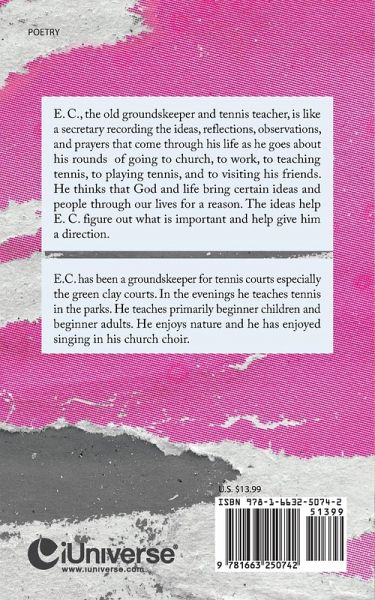 E. C., the old groundskeeper and tennis teacher, is like a secretary recording the ideas, reflections, observations, and prayers that come through his life as he goes about his rounds of going to church, to work, to teaching tennis, to playing tennis, and to visiting his friends. He thinks that God and life bring certain ideas and people through our lives for a reason. The ideas help E. C. figure out what is important and help give him a direction.