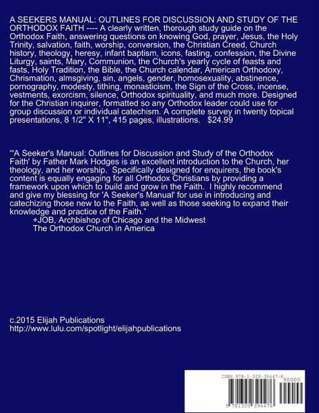 A SEEKERS MANUAL: OUTLINES FOR DISCUSSION AND STUDY OF THE ORTHODOX FAITH -- A clearly written, thorough study guide on the Orthodox Faith, answering questions on knowing God, prayer, Jesus, the Holy Trinity, salvation, faith, worship, conversion, the Christian Creed, Church history, theology, heresy, infant baptism, icons, fasting, confession, the Divine Liturgy, saints, Mary, Communion, the Church's yearly cycle of feasts, Holy Tradition, the Bible, the Church calendar, American Orthodoxy, Chrismation, almsgiving, sin, angels, gender, homosexuality, pornography, modesty, tithing, monasticism, the Sign of the Cross, incense, vestments, exorcism, silence, Orthodox spirituality, and more. Designed for the Christian inquirer, formatted so any Orthodox leader could use for group discussion. A complete survey in twenty topical presentations, 8 1/2" X 11", 415 pages, illustrations. "An excellent introduction to the Church, her theology, and her worship... I highly recommend." +JOB