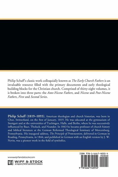 Philip Schaff's classic work colloquially known as The Early Church Fathers is an invaluable resource filled with the primary documents and early theological building blocks for the Christian church. Comprised of thirty-eight volumes, it is broken into three parts: the Ante-Nicene Fathers, and Nicene and Post-Nicene Fathers, First and Second Series.