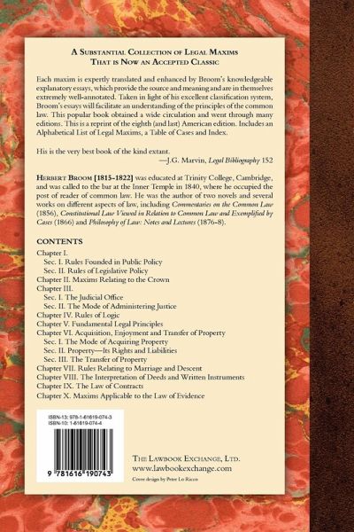 A Substantial Collection of Legal Maxims That is Now an Accepted Classic Each maxim is expertly translated, and enhanced by Broom's knowledgeable explanatory essays that provide the source and meaning, and are in themselves extremely well-annotated. Taken in light of his excellent classification system, Broom's essays will facilitate an understanding of the principles of common law. This popular book obtained a wide circulation and went through many editions, this being a reprint of the eighth (and last) American edition of 1882. Includes an Alphabetical List of Legal Maxims, a Table of Cases and Index. "His is the very best book of the kind extant." -J.G. Marvin, Legal Bibliography 152 Herbert Broom [1815-1822] was educated at Trinity College, Cambridge, and was called to the bar at the Inner Temple in 1840, where he occupied the post of reader of common law. He was the author of two novels and several works on different aspects of law, including Commentaries on the Common Law (1856), Constitutional Law Viewed in Relation to Common Law and Exemplified by Cases (1866) and Philosophy of Law: Notes and Lectures 1876-8. CONTENTS Ch.I. Sec. I. Rules Founded in Public Policy Sec. II. Rules of Legislative Policy Ch. II. Maxims Relating to the Crown Ch. III. Sec. I. The Judicial Office Sec. II. The Mode of Administering Justice Ch. IV. Rules of Logic Ch. V. Fundamental Legal Principles Ch. VI. Acquisition, Enjoyment and Transfer of Property Sec. I. The Mode of Acquiring Property Sec. II. Property-Its Rights and Liabilities Sec. III. The Transfer of Property Ch. VII. Rules Relating to Marriage and Descent Ch. VIII. The Interpretation of Deeds and Written Instruments Ch. IX. The Law of Contracts Ch. X. Maxims Applicable to the Law of Evidence