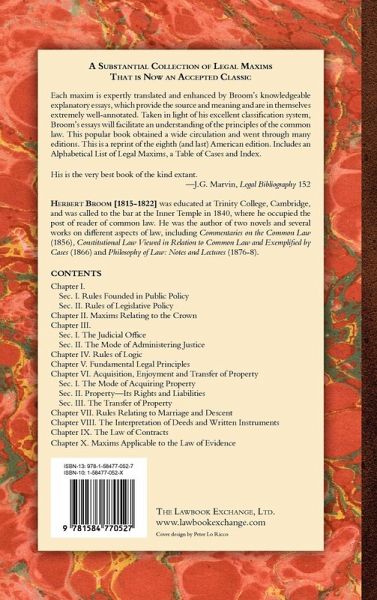 A Substantial Collection of Legal Maxims That is Now an Accepted Classic Each maxim is expertly translated, and enhanced by Broom's knowledgeable explanatory essays that provide the source and meaning, and are in themselves extremely well-annotated. Taken in light of his excellent classification system, Broom's essays will facilitate an understanding of the principles of common law. This popular book obtained a wide circulation and went through many editions, this being a reprint of the eighth (and last) American edition of 1882. Includes an Alphabetical List of Legal Maxims, a Table of Cases and Index. "His is the very best book of the kind extant." -J.G. Marvin, Legal Bibliography 152 Herbert Broom [1815-1822] was educated at Trinity College, Cambridge, and was called to the bar at the Inner Temple in 1840, where he occupied the post of reader of common law. He was the author of two novels and several works on different aspects of law, including Commentaries on the Common Law (1856), Constitutional Law Viewed in Relation to Common Law and Exemplified by Cases (1866) and Philosophy of Law: Notes and Lectures 1876-8. CONTENTS Ch.I. Sec. I. Rules Founded in Public Policy Sec. II. Rules of Legislative Policy Ch. II. Maxims Relating to the Crown Ch. III. Sec. I. The Judicial Office Sec. II. The Mode of Administering Justice Ch. IV. Rules of Logic Ch. V. Fundamental Legal Principles Ch. VI. Acquisition, Enjoyment and Transfer of Property Sec. I. The Mode of Acquiring Property Sec. II. Property-Its Rights and Liabilities Sec. III. The Transfer of Property Ch. VII. Rules Relating to Marriage and Descent Ch. VIII. The Interpretation of Deeds and Written Instruments Ch. IX. The Law of Contracts Ch. X. Maxims Applicable to the Law of Evidence