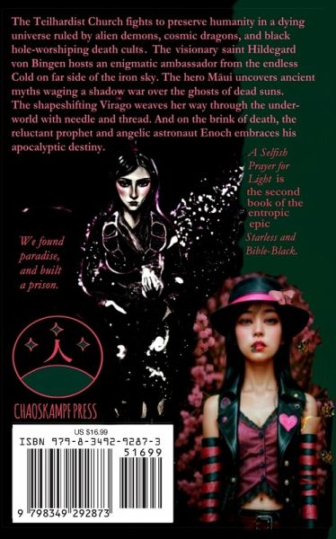 The Teilhardist Church fights to preserve human dignity in a dying universe ruled by alien demons, cosmic dragons, and black hole-worshiping death cults. The visionary saint Hildegard von Bingen hosts an enigmatic ambassador from the endless Cold on far side of the iron sky. The hero M¿ui uncovers ancient myths waging a shadow war over the ghosts of dead suns. The shapeshifting Virago weaves her way through the underworld with needle and thread. And on the brink of death, the reluctant prophet and angelic astronaut Enoch embraces his apocalyptic destiny. A Selfish Prayer for Light is the second book of the entropic epic, Starless and Bible-Black.