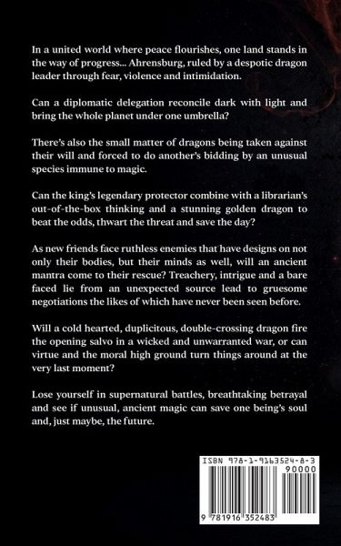 In a united world where peace flourishes, one land stands in the way of progress... Ahrensburg, ruled by a despotic dragon leader through fear, violence and intimidation. Can a diplomatic delegation reconcile dark with light and bring the whole planet under one umbrella? There's also the small matter of dragons being taken against their will and forced to do another's bidding by an unusual species immune to magic. Can the king's legendary protector combine with a librarian's out-of-the-box thinking and a stunning golden dragon to beat the odds, thwart the threat and save the day? As new friends face ruthless enemies that have designs on not only their bodies, but their minds as well, will an ancient mantra come to their rescue? Treachery, intrigue and a bare faced lie from an unexpected source lead to gruesome negotiations the likes of which have never been seen before. Will a cold hearted, duplicitous, double-crossing dragon fire the opening salvo in a wicked and unwarranted war, or can virtue and the moral high ground turn things around at the very last moment? Lose yourself in supernatural battles, breathtaking betrayal and see if unusual, ancient magic can save one being's soul and, just maybe, the future.