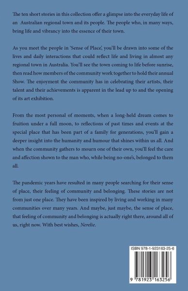 The ten short stories in this collection offer a glimpse into the everyday life of an Australian regional town and its people. The people who, in many ways, bring life and vibrancy into the essence of their town. As you meet the people in "Sense of Place', you'll be drawn into some of the lives and daily interactions that could reflect life and living in almost any regional town in Australia. You'll see the town coming to life before sunrise, then read how members of the community work together to hold their annual Show. The enjoyment the community has in celebrating their artists, their talent and their achievements is apparent in the lead up to and the opening of its art exhibition. From the most personal of moments, when a long-held dream comes to fruition under a full moon, to reflections of past times and events at the special place that has been part of a family for generations, you'll gain a deeper insight into the humour that shines within us all. And when the community gathers to mourn one of their own, you'll feel the care and affection shown to the man who, while being no-one's, belonged to them all. The pandemic years have resulted in many people searching for their sense of place, their feeling of community and belonging. These stories are not from just one place. They have been inspired by living and working in many communities over many years. And maybe, just maybe, the sense of place, that feeling of community and belonging is actually right there, around all of us, right now. With best wishes, Nerelie.