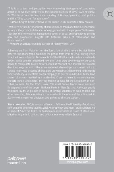 Following on from Volume I on the formation of the Urewera District Native Reserve, this monograph examines the period from 1908 to 1926, during which time the Crown subverted Tuhoe control of the UDNR, established a mere decade earlier. While Volume I described how the Tuhoe were able to deploy kin-based power to manipulate Crown power as well as confront one another, this volume describes ways in which the same ancestral descent groups closed ranks to survive nearly two decades of predatory Crown policies determined to dismantle their sanctuary. A relentless Crown campaign to purchase individual Tuhoe land shares ultimately resulted in a misleading Crown scheme to consolidate and relocate Tuhoe land shares, thereby freeing up land for the settlement of non- Tuhoe farmers. By the 1950s, over 200 small Tuhoe blocks were scattered throughout one of the largest National Parks in New Zealand. Although greatly weakened by these policies in terms of kinship solidarity aswell as land and other resources, Tuhoe resistance continued until the return of the entire park in 2014-with unreserved apologies and promises of future support.