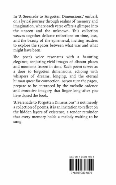 In "A Serenade to Forgotten Dimensions," embark on a lyrical journey through realms of memory and imagination, where each verse offers a glimpse into the unseen and the unknown. This collection weaves together delicate reflections on time, loss, and the beauty of the ephemeral, inviting readers to explore the spaces between what was and what might have been. The poet's voice resonates with a haunting elegance, conjuring vivid images of distant places and moments frozen in time. Each poem serves as a door to forgotten dimensions, echoing with whispers of dreams, longing, and the eternal human quest for connection. As you turn the pages, prepare to be entranced by the melodic cadence and evocative imagery that linger long after you have closed the book. "A Serenade to Forgotten Dimensions" is not merely a collection of poems; it is an invitation to reflect on the hidden layers of existence, a tender reminder that every memory holds a melody waiting to be sung.