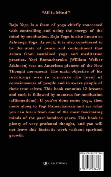 "All is Mind" Raja Yoga is a form of yoga chiefly concerned with controlling and using the energy of the mind by meditation. Raja Yoga is also known as Ashtanga Yoga. As such, it is also considered to be the state of peace and contentment that arises from sustained yoga and meditation practice. Yogi Ramacharaka (William Walker Atkinson) was an American pioneer of the New Thought movement. The main objective of his teachings was to increase the level of consciousness of people and to aware people of their true selves. This book contains 12 lessons and each is followed by mantras for meditation (affirmations). If you've done some yoga, then move along to Yogi Ramacharaka and see what you can learn from one of the most fascinating minds of the past hundred years. This book is plenty of very profound thought, and you will not leave this fantastic work without spiritual growth. LARGE PRINT EDITION, easy to read layout. EXCERPT :"The Science of Raja Yoga, to which this series of lessons is devoted, teaches, as its basic principle, the Control of the Mind. It holds that the first step toward Power consists in obtaining a control of one's own mind. It holds that the internal world must be conquered before the outer world is attacked. It holds that the "I" manifests itself in Will, and that that Will may be used to manipulate, guide, govern and direct the mind of its owner, as well as the physical world. It aims to clear away all mental rubbish, and encumbrances-to conduct a "mental house-cleaning," as it were, and to secure a clear, clean, healthy mind. Then it proceeds to control that mind intelligently, and with effect, saving all waste-power, and by means of concentration bringing the Mind in full harmony with the Will, that it may be brought to a focus and its power greatly increased and its efficiency fully secured. "