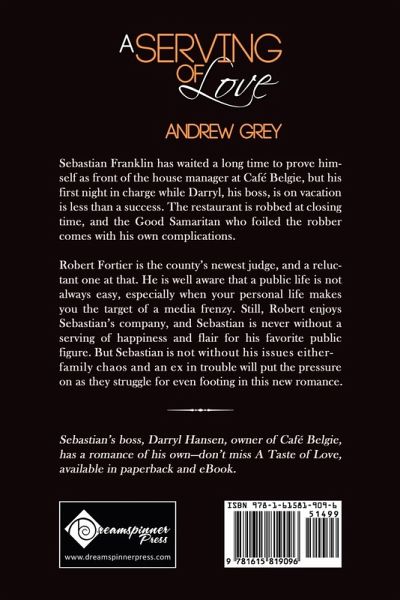 A Taste of Love Story Sebastian Franklin has waited a long time to prove himself as front of the house manager at Cafe Belgie, but his first night in charge while Darryl, his boss, is on vacation is less than a success. The restaurant is robbed at closing time, and the Good Samaritan who foiled the robber comes with his own complications. Robert Fortier is the county's newest judge, and a reluctant one at that. He is well aware that a public life is not always easy, especially when your personal life makes you the target of a media frenzy. Still, Robert enjoys Sebastian's company, and Sebastian is never without a serving of happiness and flair for his favorite public figure. But Sebastian is not without his issues either-family chaos and an ex in trouble will put the pressure on as they struggle for even footing in this new romance.