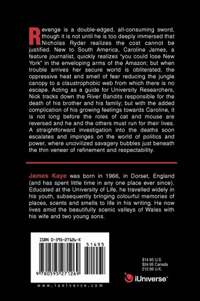 Revenge is a double-edged, all-consuming sword, though it is not until he is too deeply immersed that Nicholas Ryder realizes the cost cannot be justified. New to South America, Caroline James, a feature journalist, quickly realizes "you could lose New York" in the enveloping arms of the Amazon; but when trouble arrives her secure world is obliterated, the oppressive heat and smell of fear reducing the jungle canopy to a claustrophobic web from which there is no escape. Acting as a guide for University Researchers, Nick tracks down the River Bandits responsible for the death of his brother and his family; but with the added complication of his growing feelings towards Caroline, it is not long before the roles of cat and mouse are reversed and he and the others must run for their lives. A straightforward investigation into the deaths soon escalates and impinges on the world of politics and power, where uncivilized savagery bubbles just beneath the thin veneer of refinement and respectability.