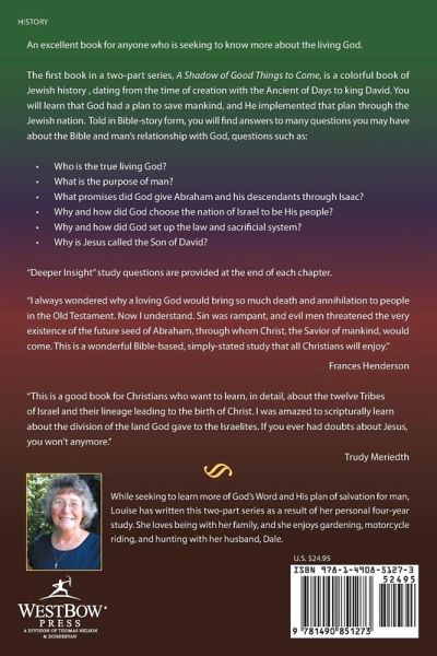 An excellent book for anyone who is seeking to know more about the living God. The first book in a two-part series, A Shadow of Good Things to Come, is a colorful book of Jewish history , dating from the time of creation with the Ancient of Days to king David. You will learn that God had a plan to save mankind, and He implemented that plan through the Jewish nation. Told in Bible-story form, you will find answers to many questions you may have about the Bible and man's relationship with God, questions such as: • Who is the true living God? • What is the purpose of man? • What promises did God give Abraham and his descendants through Isaac? • Why and how did God choose the nation of Israel to be His people? • Why and how did God set up the law and sacrificial system? • Why is Jesus called the Son of David? "Deeper Insight" study questions are provided at the end of each chapter. "I always wondered why a loving God would bring so much death and annihilation to people in the Old Testament. Now I understand. Sin was rampant, and evil men threatened the very existence of the future seed of Abraham, through whom Christ, the Savior of mankind, would come. This is a wonderful Bible-based, simply-stated study that all Christians will enjoy." Frances Henderson "This is a good book for Christians who want to learn, in detail, about the twelve Tribes of Israel and their lineage leading to the birth of Christ. I was amazed to scripturally learn about the division of the land God gave to the Israelites. If you ever had doubts about Jesus, you won't anymore." Trudy Meriedth