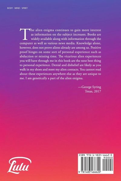 The alien enigma continues to gain more interest as information on the subject increases. Books are widely available along with information through the computer as well as various news media. Knowledge alone, however, does not prove aliens already are among us. Positive proof hinges on some sort of personal experience such as abduction or missing time. The vicarious alien experiences you will have through me in this book are the next best thing to personal experience. Denial and disbelief are likely as you walk in my shoes and meet my alien contacts. You cannot read about these experiences anywhere else as they are unique to me. I am genetically a part of the alien enigma. -George Syring Texas, 2017