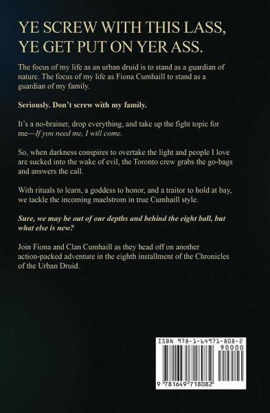 Ye screw with this lass, ye get put on yer ass. The focus of my life as an urban druid is to stand as a guardian of nature. The focus of my life as Fiona Cumhaill to stand as a guardian of my family. Seriously. Don't screw with my family. It's a no-brainer, drop everything, and take up the fight topic for me-If you need me, I will come. So, when darkness conspires to overtake the light and people I love are sucked into the wake of evil, the Toronto crew grabs the go-bags and answers the call. With rituals to learn, a goddess to honor, and a traitor to hold at bay, we tackle the incoming maelstrom in true Cumhaill style. Sure, we may be out of our depths and behind the eight ball, but what else is new?