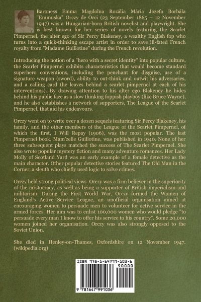 Baroness Emma Magdolna Rozália Mária Jozefa Borbála "Emmuska" Orczy de Orci (23 September 1865 – 12 November 1947) was a Hungarian-born British novelist and playwright. She is best known for her series of novels featuring the Scarlet Pimpernel, the alter ego of Sir Percy Blakeney, a wealthy English fop who turns into a quick-thinking escape artist in order to save ill-fated French royalty from "Madame Guillotine" during the French revolution. Introducing the notion of a "hero with a secret identity" into popular culture, the Scarlet Pimpernel exhibits characteristics that would become standard superhero conventions, including the penchant for disguise, use of a signature weapon (sword), ability to out-think and outwit his adversaries, and a calling card (he leaves behind a scarlet pimpernel at each of his interventions). By drawing attention to his alter ego Blakeney he hides behind his public face as a slow thinking foppish playboy (like Bruce Wayne), and he also establishes a network of supporters, The League of the Scarlet Pimpernel, that aid his endeavours. Orczy went on to write over a dozen sequels featuring Sir Percy Blakeney, his family, and the other members of the League of the Scarlet Pimpernel, of which the first, I Will Repay (1906), was the most popular. The last Pimpernel book, Mam'zelle Guillotine, was published in 1940. None of her three subsequent plays matched the success of The Scarlet Pimpernel. She also wrote popular mystery fiction and many adventure romances. Her Lady Molly of Scotland Yard was an early example of a female detective as the main character. Other popular detective stories featured The Old Man in the Corner, a sleuth who chiefly used logic to solve crimes. Orczy held strong political views. Orczy was a firm believer in the superiority of the aristocracy, as well as being a supporter of British imperialism and militarism. During the First World War, Orczy formed the Women of England's Active Service League, an unofficial organisation aimed at encouraging women to persuade men to volunteer for active service in the armed forces. Her aim was to enlist 100,000 women who would pledge "to persuade every man I know to offer his service to his country". Some 20,000 women joined her organisation. Orczy was also strongly opposed to the Soviet Union. She died in Henley-on-Thames, Oxfordshire on 12 November 1947. (wikipedia.org)