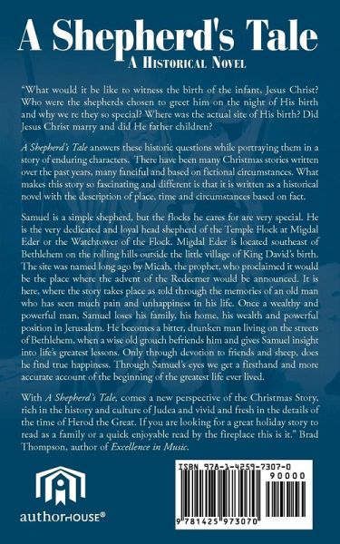 "What would it be like to witness the birth of Jesus Christ? Who were the shepherds chosen to greet him on the night of His birth and why were they so special? Where was the actual site of His birth? Did Jesus Christ marry and did He father childen? A Shepherd's Tale, answers these historic questions while portraying them in a story of endearing characters.There have been many Christmas stories written over the past years, many fanciful and based on fictional circumstances. What makes this story so fascinating and different is that it is written as a historical novel with the description of place, time and circumstances based on fact. Samuel is a simple shepherd, but the flocks he cares for are very special. He is the head shepherd of the Temple Flock at Migdal Eder or the Watchtower of the Flock. Migdal Eder is located southeast of Bethlehem on the rolling hills outside the little village of King David's birth. The site was named long ago by Micah, the prophet, who proclaimed it would be the place where the advent of the Redeemer would be announced. It is here, where the story takes place as told through the eyes of an old man who has seen much pain and unhappiness in his life. Once a wealthy and powerful man, Samuel loses his family, his home, his wealth and powerful position in Jerusalem. He becomes a bitter, drunken man living on the streets of Bethlehem, when a wise old grouch befriends him and gives Samuel insight into life's greatest lessons. Only through devotion to friends and sheep, does he find true happiness. Through Samuel's eyes we get a firsthand and more accurate account of the beginning of the greatest life ever lived. With "A Shepherd's Tale," comes a new perspective of the Christmas Story, rich in the history and culture of Judea and vivid and fresh in the details of the time of Herod the Great. If you are looking for a great holiday story to read as a family or a quick enjoyable read by the fireplace this is it." Brad Thompson, author of Excellence in Music.