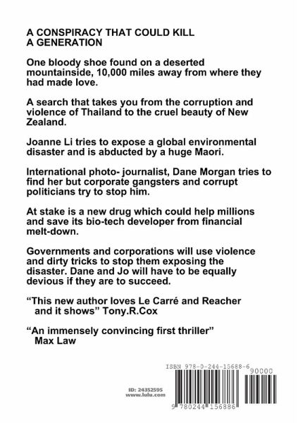 INTRIGUE, DECEIT AND VIOLENCE ON A GLOBAL SCALE One bloody shoe found on a deserted mountainside, 10,000 miles away from where they had made love. A search that takes you from the corruption and violence of Thailand to the cruel beauty of New Zealand. Joanne Li tries to expose a global environmental disaster and is abducted by a huge Maori. International photo-journalist, Dane Morgan tries to find her but corporate gangsters and corrupt politicians try to stop him. At stake is a new drug which could help millions and save its biotech developer from financial melt-down. Governments and corporations will use violence and dirty tricks to stop them exposing the disaster. Dane and Jo will have to be equally devious if they are to succeed. "This new author loves Le Carre and Reacher and it shows!" Tony. R. Cox