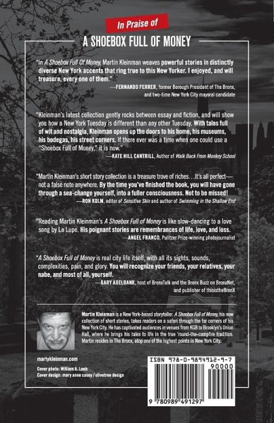 "Martin Kleinman weaves powerful stories in distinctly diverse New York accents and ring true to this New Yorker. I enjoyed, and will treasure, every one of them." --Fernando Ferrer, former Borough President of The Bronx, and two-time New York City mayoral candidate "Kleinman's latest collection gently rocks between essay and fiction, and will show you how a New York Tuesday is different than any other Tuesday. With tales full of wit and nostalgia, Kleinman opens up the doors to his home, his museums, his bodegas, his street corners. If there ever was a time when one could use a "Shoebox Full of Money", it is now." --Kate Hill Cantrill, Author of Walk Back From Monkey School "Martin Kleinman's short story collection is a treasure trove of riches. It's all perfect - not a false note anywhere. By the time you've finished the book, you will have gone through a sea-change yourself, into a fuller consciousness. Not to be missed!" --Ron Kolm, editor of Sensitive Skin and author of Swimming in the Shallow End "Reading Martin Kleinman's A Shoebox Full of Money is like slow-dancing to a love song by La Lupe. His poignant stories are remembrances of life, love, and loss." --Angel Franco, Pulitzer Prize-winning photojournalist "A Shoebox Full of Money is real city life itself, with all its sights, sounds, complexities, pain, and glory. You will recognize your friends, your relatives, your nabe, and most of all, yourself." --Gary Axelbank, host of BronxTalk and the Bronx Buzz on BronxNet, and publisher of thisistheBronX A Shoebox Full of Money, Martin Kleinman's all-new collection of short stories, takes readers on an unforgettable safari through the far corners of his New York City. A partial list of Martin's cast of characters includes: "the world's littlest shrink"; an East Bronx gambler in white vicuña; the U.S. handball champ who drove a bakery truck; the data encryption guru who unlocked online shopping but could not escape his past; a lusty lounge singer at the top of her profession; a war veteran's exhausted mom; childhood sweethearts now in career ascendency; a street photographer caught in his maze of memories; a wine chugging playground b-baller; the first Jewish Miss America; the one-time queen of salsa, La Lupe; and many more.