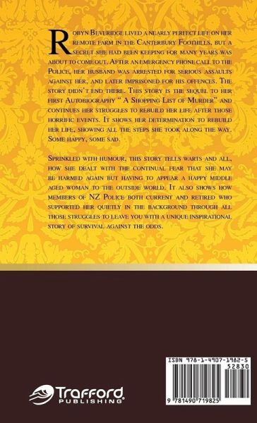 This story is about a woman who suffered a serious assault as a result of her husbands actions. Once he had been through the court system, and was imprisoned the story didn't end. Robyn had to rebuild her world and start again, always considering she could be harmed again. Slowly, step by step, she did the things she could to start her new life. Her world had to change totally. The story tells of that rebuilding, of the laughs, tears, and challenges that she faced every step of the way. In the background, she had the support of members of New Zealand Police, both working and retired who supported, encouraged, laughed with her. Without their support the story would have been totally different. This story tells of one woman's life after a crime that the Public would never see.