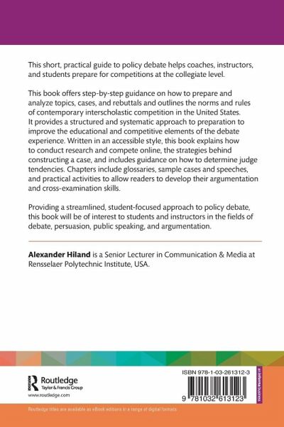 This book offers step-by-step guidance on how to prepare and analyze topics, cases, and rebuttals and outlines the norms and rules of contemporary interscholastic competition in the United States. This book will be of interest to students and instructors in the fields of debate, persuasion, public speaking, and argumentation.
