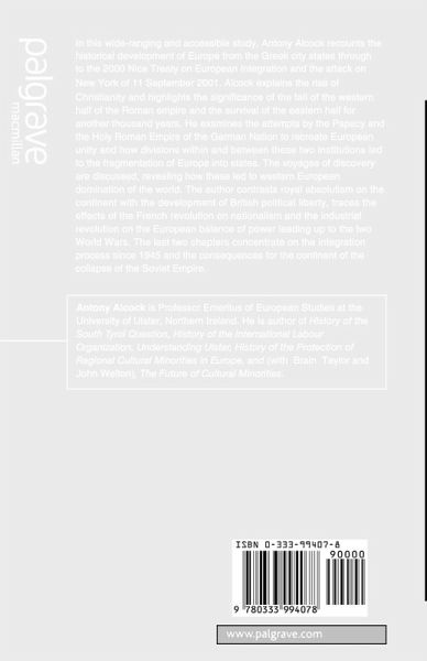 In this work, Antony Alcock recounts the historical development of Europe from the Greek city states through to the 2000 Nice Treaty on European Integration and the attack on New York of 11 September 2001. This Short History of Europe is told simply and accessibly, yet provides the political, economic, social and cultural context for Europe's increasing integration, based on the three pillars of Greek political thought, Roman law and the Christian religion, including analysis of new material, Antony Alcock brings his history fully up-to-date looking at such issues as the collapse of Yugoslavia, immigration and asylum seekers and finally consideration of the future of Europe in the twenty first century.