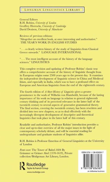 This complete revision and updating of Professor Robins' classic text offers a comprehensive account of the history of linguistic thought from its European origins some 2500 years ago to the present day. It examines the independent development of linguistic science in China and Medieval Islam, and especially in India, which was to have a profound effect on European and American linguistics from the end of the eighteenth century. The fourth edition of A Short History of Linguistics gives a greater prominence to the work of Wilhelm von Humboldt, because of the lasting importance of his work on language in relation to general eighteenth century thinking and of its perceived relevance in the latter half of the twentieth century to several aspects of generative grammatical theory. The final section, covering the twentieth century, has been rewritten and divided into two new chapters, so as to deal effectively with the increasingly divergent development of descriptive and theoretical linguistics that took place in the latter half of this century. Readable and authoritative, Professor Robins' introduction provides a clear and up-to-date overview of all the major issues in the light of contemporary scholarly debate, and will be essential reading for undergraduate and graduate students of linguistics alike.