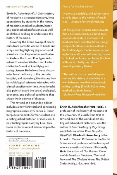 Erwin H. Ackerknecht's A Short History of Medicine is a concise narrative, long appreciated by students in the history of medicine, medical students, historians, and medical professionals as well as all those seeking to understand the history of medicine. Covering the broad sweep of discoveries from parasitic worms to bacilli and x-rays, and highlighting physicians and scientists from Hippocrates and Galen to Pasteur, Koch, and Roentgen, Ackerknecht narrates Western and Eastern civilization's work at identifying and curing disease. He follows these discoveries from the library to the bedside, hospital, and laboratory, illuminating how basic biological sciences interacted with clinical practice over time. But his story is more than one of laudable scientific and therapeutic achievement. Ackerknecht also points toward the social, ecological, economic, and political conditions that shape the incidence of disease. Improvements in health, Ackerknecht argues, depend on more than laboratory knowledge: they also require that we improve the lives of ordinary men and women by altering social conditions such as poverty and hunger. This revised and expanded edition includes a new foreword and concluding biographical essay by Charles E. Rosenberg, Ackerknecht's former student and a distinguished historian of medicine. A new bibliographic essay by Lisa Haushofer explores recent scholarship in the history of medicine.