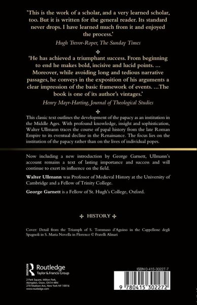This classic text outlines the development of the Papacy as an institution in the Middle Ages. With profound knowledge, insight and sophistication, Walter Ullmann traces the course of papal history from the late Roman Empire to its eventual decline in the Renaissance.