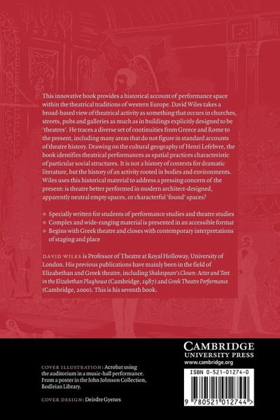 David Wiles considers theatrical activity "happening" in churches, streets, pubs and galleries, as well as in buildings explicitly designed to be "theaters," in this historical account. Surveying performance space usage within the traditions of Western Europe, Wiles traces a diverse set of continuities, from Greece and Rome to the present, including many areas not included in standard accounts of theater history.