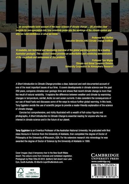 A Short Introduction to Climate Change provides a clear, balanced and well documented account of one of the most important issues of our time. It covers developments in climate science over the past 250 years and shows that recent climate change is more than the result of natural variability. It explains the difference between weather and climate by examining changes in temperature, rainfall, Arctic ice and ocean currents. It also considers the consequences of our use of fossil fuels and discusses some of the ways to reduce further global warming. Tony Eggleton avoids the use of scientific jargon to provide a reader-friendly explanation of the science of climate change. Concise but comprehensive and richly illustrated with a wealth of full-colour figures and photographs, A Short Introduction to Climate Change is essential reading for anyone who has an interest in climate science and in the future of our planet. For more information please see http://www.tonyeggleton.id.au