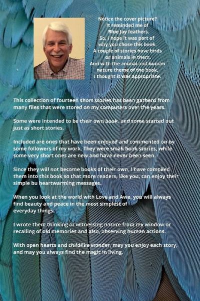 A Collection of fourteen (*bonus 15 in softcover edition) of the author's short stories have been gathered into this one book. Some are long enough to have been a small book on their own and some are very short. The theme of the stories is that of human and animal nature. They are heartwarming and full of nature's natural interest and beauty. Even the cover reflects a blue jay's feathers. With open hearts and child-like wonder, may you enjoy each story, and may you always find the magic in living.