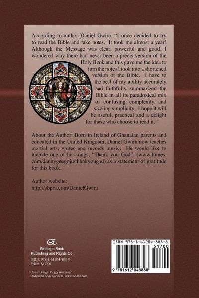 According to author Daniel Gwira, "I once decided to try to read the Bible and take notes. It took me almost a year! Although the Message was clear, powerful and good, I wondered why there had never been a précis version of the Holy Book and this gave me the idea to turn the notes I took into a shortened version of the Bible. I have to the best of my ability accurately and faithfully summarised the Bible in all its paradoxical mix of confusing complexity and sizzling simplicity. I hope it will be useful, practical and a delight for those who choose to read it." About the Author: Born in Ireland of Ghanaian parents and educated in the United Kingdom, Daniel Gwira now teaches martial arts, writes and records music.