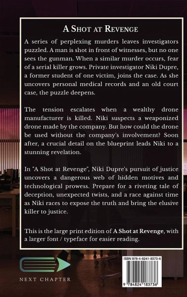 A series of perplexing murders leaves investigators puzzled. A man is shot in front of witnesses, but no one sees the gunman. When a similar murder occurs, fear of a serial killer grows. Private investigator Niki Dupre, a former student of one victim, joins the case. As she uncovers personal medical records and an old court case, the puzzle deepens. The tension escalates when a wealthy drone manufacturer is killed. Niki suspects a weaponized drone made by the company. But how could the drone be used without the company's involvement? Soon after, a crucial detail on the blueprint leads Niki to a stunning revelation. In "A Shot at Revenge", Niki Dupre's pursuit of justice uncovers a dangerous web of hidden motives and technological prowess. Prepare for a riveting tale of deception, unexpected twists, and a race against time as Niki races to expose the truth and bring the elusive killer to justice. This is the large print edition of A Shot at Revenge, with a larger font / typeface for easier reading.