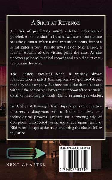 A series of perplexing murders leaves investigators puzzled. A man is shot in front of witnesses, but no one sees the gunman. When a similar murder occurs, fear of a serial killer grows. Private investigator Niki Dupre, a former student of one victim, joins the case. As she uncovers personal medical records and an old court case, the puzzle deepens. The tension escalates when a wealthy drone manufacturer is killed. Niki suspects a weaponized drone made by the company. But how could the drone be used without the company's involvement? Soon after, a crucial detail on the blueprint leads Niki to a stunning revelation. In "A Shot at Revenge", Niki Dupre's pursuit of justice uncovers a dangerous web of hidden motives and technological prowess. Prepare for a riveting tale of deception, unexpected twists, and a race against time as Niki races to expose the truth and bring the elusive killer to justice.