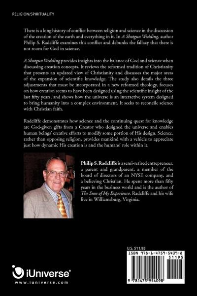 There is a long history of conflict between religion and science in the discussion of the creation of the earth and everything in it. In A Shotgun Wedding, author Philip S. Radcliffe examines this conflict and debunks the fallacy that there is not room for God in science. A Shotgun Wedding provides insights into the balance of God and science when discussing creation concepts. It reviews the reformed tradition of Christianity that presents an updated view of Christianity and discusses the major areas of the expansion of scientific knowledge. The study also details the three adjustments that must be incorporated in a new reformed theology, focuses on how creation seems to have been designed using the scientific insight of the last fifty years, and shows how the universe is an interactive system designed to bring humanity into a complex environment. It seeks to reconcile science with Christian faith. Radcliffe demonstrates how science and the continuing quest for knowledge are God-given gifts from a Creator who designed the universe and enables human beings' creative efforts to modify some portion of His design. Science, rather than opposing religion, provides mankind with a vehicle to appreciate just how dynamic His creation is and the humans' role within it.