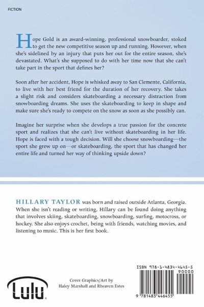 Hope Gold is an award-winning, professional snowboarder, stoked to get the new competitive season up and running. However, when she's sidelined by an injury that puts her out for the entire season, she's devastated. Soon after her accident, Hope is whisked away to San Clemente, California, to live with her best friend for the duration of her recovery. She takes a slight risk and considers skateboarding a necessary distraction from snowboarding dreams. She uses the skateboarding to keep in shape and make sure she's ready to compete on the snow as soon as she possibly can. Imagine her surprise when she develops a true passion for the concrete sport and realizes that she can't live without skateboarding in her life. Hope is faced with a tough decision. Will she choose snowboarding-the sport she grew up on-or skateboarding, the sport that has changed her entire life and turned her way of thinking upside down?