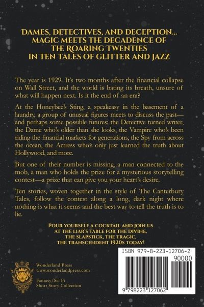 Dames, detectives, and deception...magic meets the decadence of the Roaring Twenties in ten tales of glitter and jazz. The year is 1929. It's two months after the financial collapse on Wall Street, and the world is bating its breath, unsure of what will happen next. Is it the end of an era? At the Honeybee's Sting, a speakeasy in the basement of a laundry, a group of unusual figures meets to discuss the past-and perhaps some possible futures: the Detective turned writer, the Dame who's older than she looks, the Vampire who's been riding the financial markets for generations, the Spy from across the ocean, the Actress who's only just learned the truth about Hollywood, and more. But one of their number is missing, a man connected to the mob, a man who holds the prize for a mysterious storytelling contest-a prize that can give you your heart's desire. Ten stories, woven together in the style of The Canterbury Tales, follow the contest along a long, dark night where nothing is what it seems and the best way to tell the truth is to lie. Pour yourself a cocktail and join us at the liar's table for the divine, the slapstick, the tragic, the transcendent 1920s today! Table of Contents: The Liar's Table When Pigs Fly Myrna and the Thirteen-Year Witch All the Retros at the New Cotton Club The Mysterious Artifact Memento Temporis The Page-Turners The Last Word Cocktail The Man Who Would Sell Fear The Liar's Table, Part 2