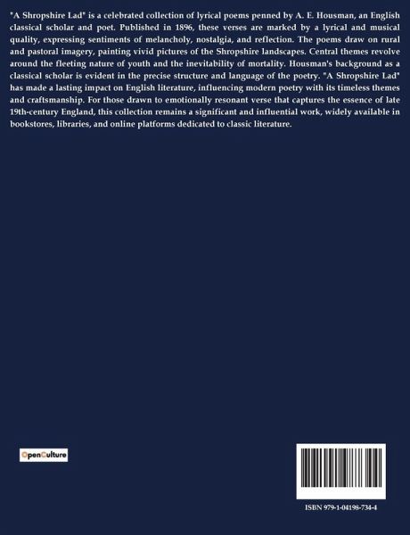 "A Shropshire Lad" is a celebrated collection of lyrical poems penned by A. E. Housman, an English classical scholar and poet. Published in 1896, these verses are marked by a lyrical and musical quality, expressing sentiments of melancholy, nostalgia, and reflection. The poems draw on rural and pastoral imagery, painting vivid pictures of the Shropshire landscapes. Central themes revolve around the fleeting nature of youth and the inevitability of mortality. Housman's background as a classical scholar is evident in the precise structure and language of the poetry. "A Shropshire Lad" has made a lasting impact on English literature, influencing modern poetry with its timeless themes and craftsmanship. For those drawn to emotionally resonant verse that captures the essence of late 19th-century England, this collection remains a significant and influential work, widely available in bookstores, libraries, and online platforms dedicated to classic literature.