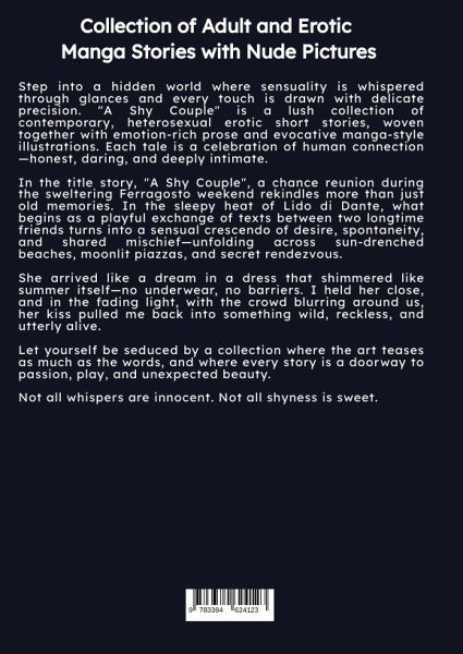 Step into a hidden world where sensuality is whispered through glances and every touch is drawn with delicate precision. "A Shy Couple" is a lush collection of contemporary, heterosexual erotic short stories, woven together with emotion-rich prose and evocative manga-style illustrations. Each tale is a celebration of human connection-honest, daring, and deeply intimate.In the title story, "A Shy Couple", a chance reunion during the sweltering Ferragosto weekend rekindles more than just old memories. In the sleepy heat of Lido di Dante, what begins as a playful exchange of texts between two longtime friends turns into a sensual crescendo of desire, spontaneity, and shared mischief-unfolding across sun-drenched beaches, moonlit piazzas, and secret rendezvous.She arrived like a dream in a dress that shimmered like summer itself-no underwear, no barriers. I held her close, and in the fading light, with the crowd blurring around us, her kiss pulled me back into something wild, reckless, and utterly alive.Let yourself be seduced by a collection where the art teases as much as the words, and where every story is a doorway to passion, play, and unexpected beauty.Not all whispers are innocent. Not all shyness is sweet.