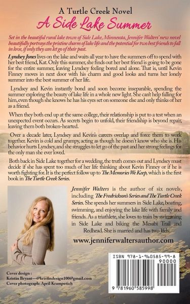 Set in the beautiful rural lake town of Side Lake, Minnesota, Jennifer Walters' new novel beautifully portrays the pristine charm of lake life and the potential for two best friends to fall in love, if only they can let go of their past. Lyndsey Jones lives on the lake and waits all year to have the summers off to spend with her best friend, Kat. Only this summer, she finds out her best friend is going to be gone for the entire summer, leaving Lyndsey feeling bored and alone. That is, until Kevin Finney moves in next door with his charm and good looks and turns her lonely summer into the best summer of her life.Lyndsey and Kevin instantly bond and soon become inseparable, spending the summer exploring the beauty of lake life in a whole new light. She can't help falling for him, even though she knows he has his eyes set on someone else and only thinks of her as a friend. When they both end up at the same college, their relationship is put to a test when an unexpected event occurs. As secrets begin to unfold, their friendship is beyond repair, leaving them both broken-hearted.Over a decade later, Lyndsey and Kevin's careers overlap and force them to work together. Kevin is cold and grumpy, acting as though he doesn't know who she is. His behavior hurts Lyndsey, and she struggles to let go of the past and her strong feelings for the only man she ever loved. Both back in Side Lake together for a wedding, the truth comes out and Lyndsey must decide if she has spent too much of her life thinking about Kevin Finney or if he is worth fighting for. It is the perfect follow up to The Memories We Keep, which is the first book in The Turtle Creek Series.