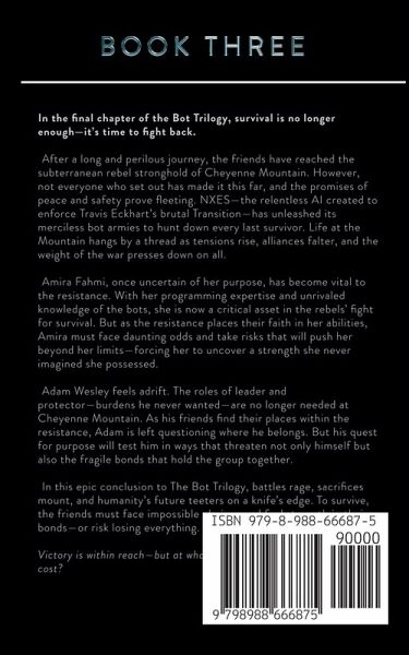 In the final chapter of the Bot Trilogy, survival is no longer enough-it's time to fight back. After a long and perilous journey, the friends have reached the subterranean rebel stronghold of Cheyenne Mountain. However, not everyone who set out has made it this far, and the promises of peace and safety prove fleeting. NXES-the relentless AI created to enforce Travis Eckhart's brutal Transition-has unleashed its merciless bot armies to hunt down every last survivor. Life at the Mountain hangs by a thread as tensions rise, alliances falter, and the weight of the war presses down on all. Amira Fahmi, once uncertain of her purpose, has become vital to the resistance. With her programming expertise and unrivaled knowledge of the bots, she is now a critical asset in the rebels' fight for survival. But as the resistance places their faith in her abilities, Amira must face daunting odds and take risks that will push her beyond her limits-forcing her to uncover a strength she never imagined she possessed. Adam Wesley feels adrift. The roles of leader and protector-burdens he never wanted-are no longer needed at Cheyenne Mountain. As his friends find their places within the resistance, Adam is left questioning where he belongs. But his quest for purpose will test him in ways that threaten not only himself but also the fragile bonds that hold the group together. In this epic conclusion to The Bot Trilogy, battles rage, sacrifices mount, and humanity's future teeters on a knife's edge. To survive, the friends must face impossible choices and find strength in their bonds-or risk losing everything. Victory is within reach-but at what cost?