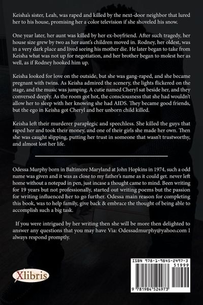 Keisha's sister, Leah, was raped and killed by the next-door neighbor that lured her to his house, promising her a color television if she shoveled his snow. One year later, her aunt was killed by her ex-boyfriend. After such tragedy, her house size grew by two as her aunt's children moved in. Rodney, her oldest, was in a very dark place and lived seeing his mother die. He later began to take from Keisha what was not up for negotiation, and her brother began to molest her as well, as if Rodney hooked him up. Keisha looked for love on the outside, but she was gang-raped, and she became pregnant with twins. As Keisha admired the scenery, the lights flickered on the stage, and the music was jumping. A cutie named Cheryl sat beside her, and they conversed deeply. As the room got hot, the consciousness that she had wouldn't allow her to sleep with her knowing she had AIDS. They became good friends, but the ego in Keisha got Cheryl and her unborn child killed. Keisha left their murderer paraplegic and speechless. She killed the guys that raped her and took their money, and one of their girls she made her own. Then she was caught slipping, putting her trust in someone that wasn't trustworthy, and almost lost her life.
