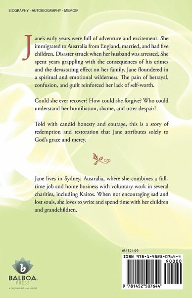 Jane's early years were full of adventure and excitement. She immigrated to Australia from England, married, and had five children. Disaster struck when her husband was arrested. She spent years grappling with the consequences of his crimes and the devastating effect on her family. Jane floundered in a spiritual and emotional wilderness. The pain of betrayal, confusion, and guilt reinforced her lack of self-worth. Could she ever recover? How could she forgive? Who could understand her humiliation, shame, and utter despair? Told with candid honesty and courage, this is a story of redemption and restoration that Jane attributes solely to God's grace and mercy.