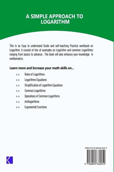A Simple Approach to Logarithm This is an Easy to understand Guide and self-teaching Practice workbook on Logarithm. It consist of lots of examples on Logarithm and common Logarithms ranging from basics to advance . The book will also enhance your knowledge in mathematics. Learn more and Increase your math skills on... Rules of Logarithms Logarithms Equations Simplification of Logarithm Equations Common Logarithms Operations of Common Logarithms Antilogarithms Exponential Functions improve your math skills by grabbing a copy now...