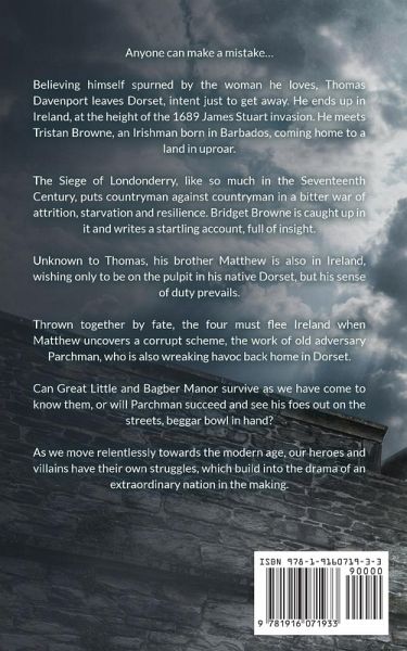 Anyone can make a mistake… Believing himself spurned by the woman he loves, ThomasDavenport leaves Dorset, intent just to get away. He ends up inIreland, at the height of the 1689 James Stuart invasion. He meetsTristan Browne, an Irishman born in Barbados, coming home to aland in uproar. The Siege of Londonderry, like so much in the SeventeenthCentury, puts countryman against countryman in a bitter war ofattrition, starvation and resilience. Bridget Browne is caught up init and writes a startling account, full of insight. Unknown to Thomas, his brother Matthew is also in Ireland,wishing only to be on the pulpit in his native Dorset, but his senseof duty prevails. Thrown together by fate, the four must flee Ireland whenMatthew uncovers a corrupt scheme, the work of old adversaryParchman, who is also wreaking havoc back home in Dorset. Can Great Little and Bagber Manor survive as we have come toknow them, or will Parchman succeed and see his foes out on thestreets, beggar bowl in hand? As we move relentlessly towards the modern age, our heroes andvillains have their own struggles, which build into the drama of anextraordinary nation in the making.