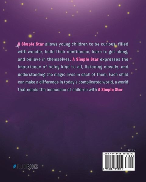 A Simple Star allows young children to be curious, filled with wonder, build their confidence, learn to get along, and believe in themselves. A Simple Star expresses the importance of being kind to all, listening closely, and understanding the magic lives in each of them. Each child can make a difference in today's complicated world, a world that needs the innocence of children with A Simple Star.