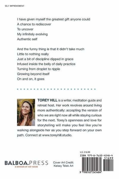 A Single Droplet is an interactive book that guides you along small, gradual steps toward your authentic self. I consider the authentic self to be a state of wholeness and continuous wonder; where we have acceptance for who we are in this moment and embrace our inevitable evolution. Common barriers to living this way include fear, shame, and overwhelm. A way to work through these barriers and receive the gift of authenticity is to read these words and take actionable steps, which are, in this case, daily practices. By the end of this process, you will have nourished your well-being to the point where your authentic self can't help but peek through the doorway you've built and walk in as you continue the daily practices on your own. "We're all given the gift of life and in that gift comes tricks and mirages and thousands of ways to sabotage our incredible ability to shine bright. Those meanderings are where the good in us becomes magnificent. In these gracious pages, Torey gives her readers pathways and tools to witness how naturally extraordinary we all are, whilst holding you in her arms the entire way." - Adrea L. Peters, award-winning author and entrepreneur "Torey is a skillful and deeply authentic guide. She understands what people need to feel a greater sense of personal connection, ease and grace in their lives. Her words are mesmerizing, and A Single Droplet will speak directly to the heart of all who read it." - Kate Snowise, Professional Coach & Podcaster "A Single Droplet is a kind, trusted companion designed to help you find your way home. Poetic, beautifully real and filled with evidence-based pearls of wisdom, Torey's mindfulness and self-care practices are the perfect antidote to modern life. Her invitation to slow down, reconnect with who you are and care deeply for your body, mind and soul is just what we need. This couldn't have come at a better time. Brave and kind, I love this gem of a book. Bravo Torey, well done!" - Renee Trudeau, catalyst/retreat facilitator and author "Nurturing the Soul of Your Family: 10 Ways to Reconnect & Find Peace in Everyday Life."