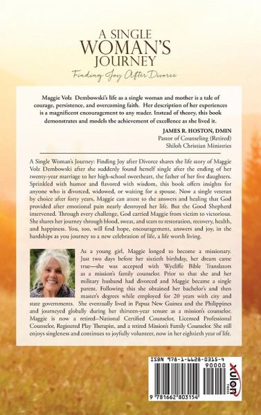 Maggie Volz Dembowski's life as a single woman and mother is a tale of courage, persistence, and overcoming faith. Her description of her experiences is a magnificent encouragement to any reader. Instead of theory, this book demonstrates and models the achievement of excellence as she lived it.James R. Hoston, DMinPastor of Counseling (Retired)Shiloh Christian Ministries A Single Woman's Journey: Finding Joy after Divorce shares the life story of Maggie Volz Dembowski after she suddenly found herself single after the ending of her twenty-year marriage to her high-school sweetheart, the father of her five daughters. Sprinkled with humor and flavored with wisdom, this book offers insights for anyone who is divorced, widowed, or waiting for a spouse. Now a single veteran by choice after forty years, Maggie can attest to the answers and healing that God provided after emotional pain nearly destroyed her life. But the Good Shepherd intervened. Through every challenge, God carried Maggie from victim to victorious. She shares her journey through blood, sweat, and tears to restoration, recovery, health, and happiness. You, too, will find hope, encouragement, answers and joy, in the hardships as you journey to a new celebration of life, a life worth living. As a young girl, Maggie longed to become a missionary. Just two days before her sixtieth birthday, her dream came true-she was accepted with Wycliffe Bible Translators as a mission's family counselor. Prior to that she and her military husband had divorced and Maggie became a single parent. Following this she obtained her bachelor's and then master's degrees while employed for 20 years with city and state governments. She eventually lived in Papua New Guinea and the Philippines and journeyed globally during her thirteen-year tenure as a mission's counselor. Maggie is now a retired--National Certified Counselor, Licensed Professional Counselor, Registered Play Therapist, and a retired Mission's Family Counselor. She still enjoys singleness and continues to joyfully volunteer, now in her eightieth year of life.